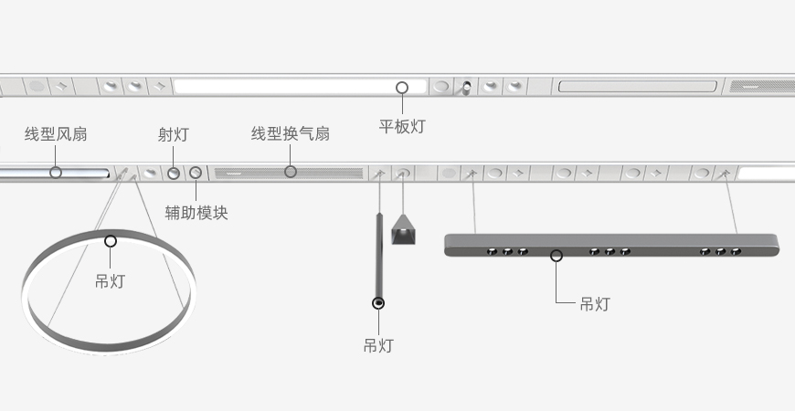 照明、電器、風(fēng)扇等多品類組件在FreeX組合燈一線之上自由組合,你的頂面生態(tài)你做主。