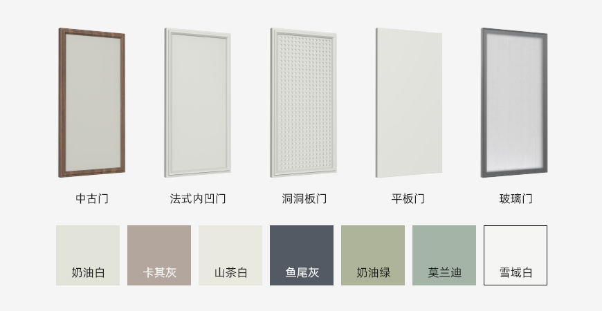 提供中古門(mén)、法式內(nèi)凹門(mén)、洞洞板門(mén)、平板門(mén)、玻璃門(mén)等五種門(mén)型,搭配7種高顏值配色,適配北歐、現(xiàn)代、輕奢等多種裝修風(fēng)格。